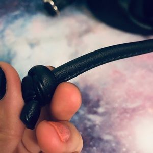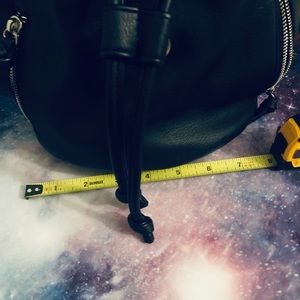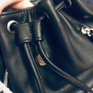 Mini black drawstring backpack by Mossimo featuring a magnetic closure to secure the top flap to the body of the purse once you've pulled it closed. Two zippered pockets outside and one inside.