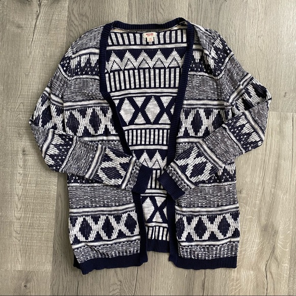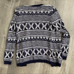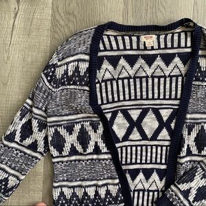 This lightweight cardigan is navy and white with a distressed pattern/texture. Great for layering on chillier days!