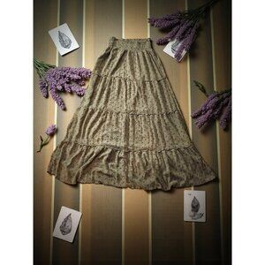 Soft and flowy olive green maxi skirt by Mossimo Supply Co. Features a tiered design with subtle floral print, a stretchy smocked waistband, and breezy rayon fabric for comfortable all-day wear. Easy to style for casual days, cottagecore vibes, or layered with boots and sweaters for fall.