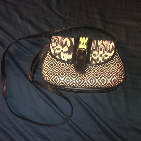 Small black, cream and neon green cross-body purse. Snap closure, the buckle is just for show. Adjustable shoulder strap.