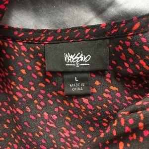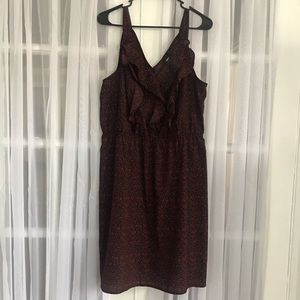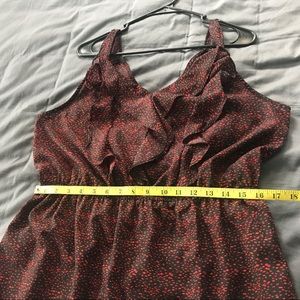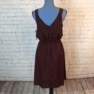 Great dress for work! The pattern is red, dark orange, and dark pink on black, but looks red on black. The dress has an elastic waist. EUC