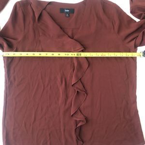 Upgrade your wardrobe with this beautiful Mossimo Ruffle Front Blouse, perfect for any occasion. The rich Burgundy color and Solid pattern make it an elegant addition to your clothing collection. The blouse features a V-Neckline, Long Sleeves, and a Pullover Closure, making it comfortable and easy to wear.