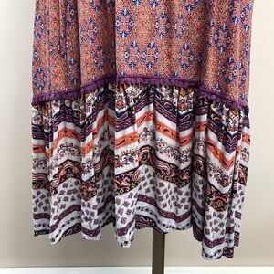 Mossimo Supply Co Boho Spaghetti Strap Paisley Floral Crochet Trim Dress in size XL. Great preowned condition. Pullover style, tiered, crochet lace trim. Please see photos for approximate measurements and details. Item may show difference in color based upon photography and perception. Photos are part of the description, as everyone’s level of condition may vary. From smoke free and pet free home. All packages are shipped the same or next business day.