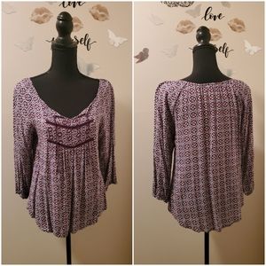 This dressy tunic top is fit for a casual event. This purple, blue and pink top has a drawstring that the top. So you can tie the front of the shirt. Draper across the front, in the chest chest area. In purple are two sections, design with see through squares. The sleeves stop a little above your wrist area. This shirt has been worn a few times. In great condition.