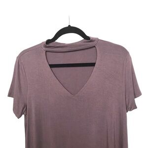 Mauve purple, short sleeve tee dress with neck cut out detail. New with tags but has some fading on upper back and a spot on back towards bottom hem. See last 3 photos. Has stretch.