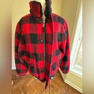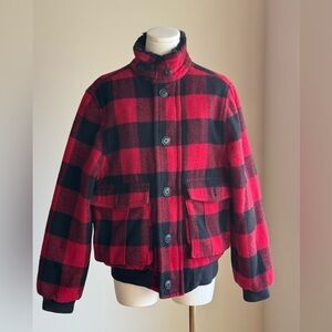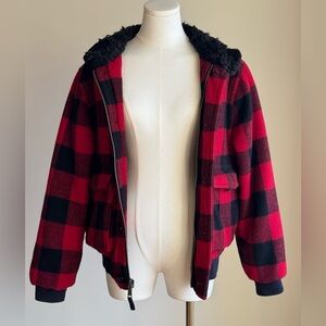 Stylish bomber jacket with a bold red and black plaid pattern. Features both button and zipper closure and front pockets, Sherpa collar , fully lined. 60%wool, 40% polyester, lining 100% polyester. Great pre owned condition. Perfect for casual wear.