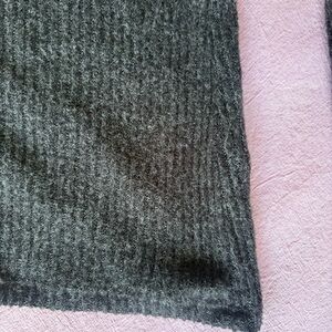 Sweater is thin but cozy and warm. Soft, comfortable, and has a good amount of stretch. A great basic that can be styled many ways, or perfect for layering to stay warm during outdoor activities in the cold. Sweater is ribbed and heathered dark grey. Turtleneck can be folded or scrunched depending on preference.