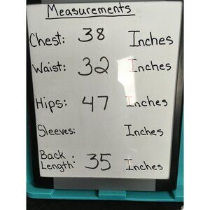 Chest = 38 inches, Waist = 32 inches, Hips = 47 inches, Back Length = 35 inches