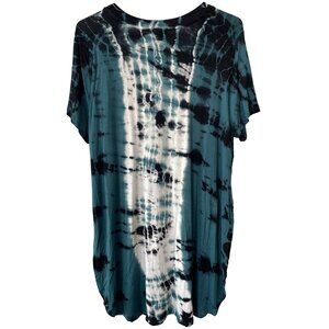 This stylish tie-dye T-shirt features a versatile teal and black pattern, short sleeves, and is crafted from a soft rayon-spandex blend for lightweight comfort.