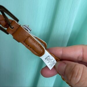 Lace top half, cinched waist with braided brown belt and rose gold buckle, button front, no stretch.