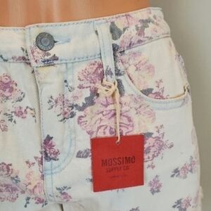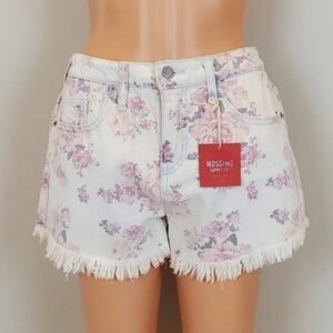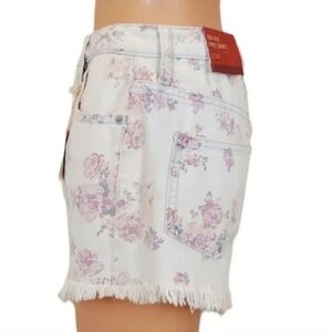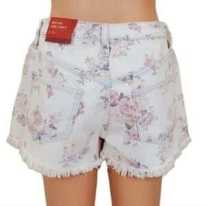 Stylish floral denim shorts. Features a frayed hem. Perfect for casual outings.