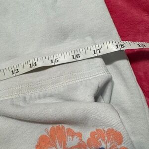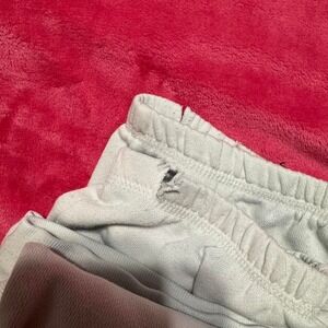 White cuffed ankle sweats with embroidered detail on front. Size L. Waist is 17 inches measured flat & inseam is 22.5 inches. Rip on ankle cuffs as shown in last image.