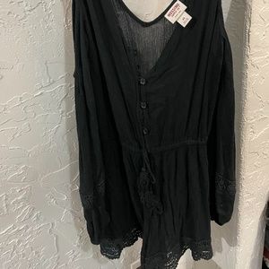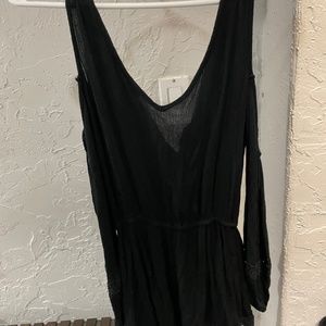 Short Black Peek A Boo Shoulder Romper. Super sexy for a night out or just a casual shopping day. Brand is Mossimo by Target and Size is XS. Lace on bottom of shorts and cutout shoulders.