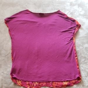 Gorgeous bright print in a light rayon material in the front with a light soft magenta tshirt material in the back! Super cute for spring or summer with white shorts or capris!