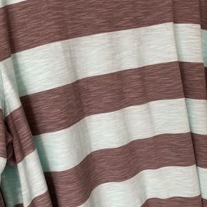 Cute top features sleeves that roll up and can be secured with button. Colors are gray and light aqua-pictures don’t do the color justice, it’s even prettier in person. Plus size 2 is equivalent to 20/22, according to size chart-see photo.