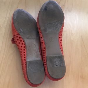 Man made coral suede flats with perforated sides. Only worn twice. Scuff on left inside heel. Mark could possibly be cleaned, see photos.