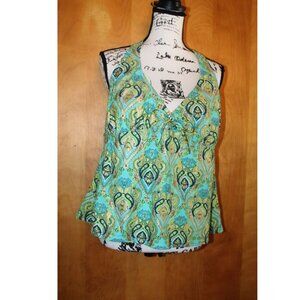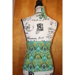 Mossimo tankini top with a cute tie in front. Trending to wear swim pieces with clothing so I see this styled with denim bottom and jacket. 22" bodice to hem,20" pit to pit. Tied behind neck, with a brillient teal, navy, gold, green pattern to wear with denim or neutrals. NWT from a smoke-free, pet-free home.