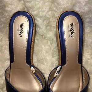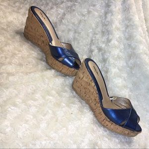 Blue faux leather upper and tan faux cork lower wedges. 3 1/2" heel with 1" platform. All man made materials, women's size 6. Very good used condition.