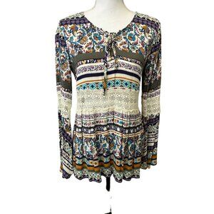 A bohemian-inspired top with a peasant style, featuring bell sleeves and a scoop neck. The pattern and color scheme add a touch of cottage core charm.