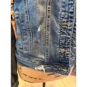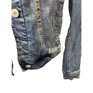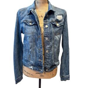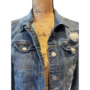 Keywords: Mossimo, denim jacket, women's jacket, medium size, blue jacket, casual wear, distressed denim, button closure, long sleeve, adjustable cuffs, classic collar, short length, solid pattern, pre-owned, basic style.