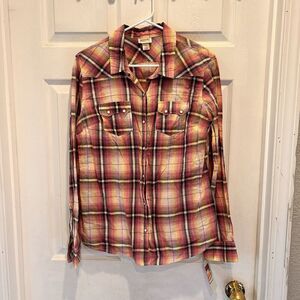 Mossimo Womens Flannel Western Top L Pink Plaid Pearl Snap Long Sleeve Jrs NWT