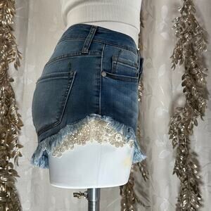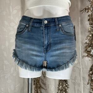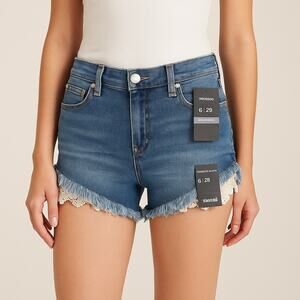 NWT Mossimo women’s high-rise denim shorts, size 6/28. Designed with a soft vintage wash, frayed raw hem, and peekaboo ivory crochet lace trim for a boho-chic finish. Super-stretch denim hugs curves in all the right places. Classic 5-pocket style and zip fly.