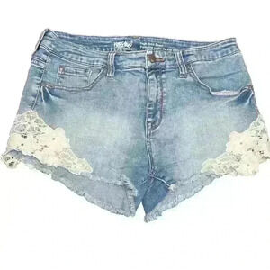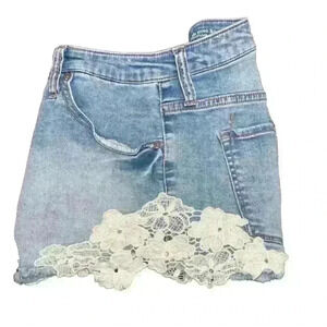 Stylish blue denim shorts with lace trim. Perfect for casual wear.