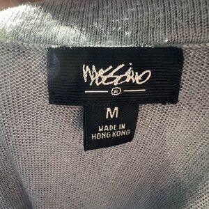 This is a women's sleeveless mock turtleneck sweater in size M. It is made of lightweight acrylic knit fabric in a solid gray color. The brand is Mossimo and it is a pullover style sweater.