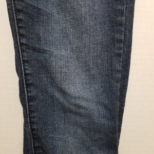 Skinny denim jeans. Whiskering. 5 pockets. Zip fly with single button closure. 2010. Low rise, low waist, stretch.