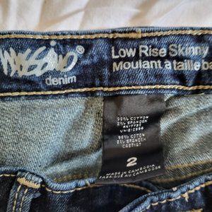 Mossimo low rise skinny ripped jeans size 2. Worn, but in good condition. A little pull on the back leg, still looks very good!