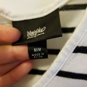 This is a medium Mossimo black and white striped tee. It has a silver zipper detail on the back (functional) and a high low hem.