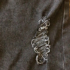 Mossimo brand women’s black jean skirt with distress patterns on front. Size 4 (27). Cotton/spandex blend.
