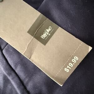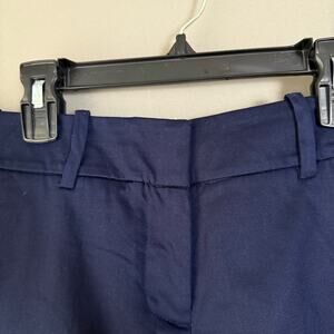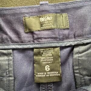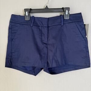 These are Mossimo brand shorts, size 6, in new condition with original tags. The shorts are a solid navy blue color and appear to be made of a cotton blend. They feature a standard button and zipper closure, belt loops, and front and back pockets. The material is smooth and free of any visible stains or damage. The original price tag indicates a price of $19.99.