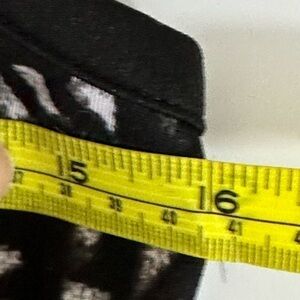 Very nice summery dress in black with a circular design in white. Knit fabric with very little stretch. Accent band at the waist. Racer back very cute on measurements are pit to pit flatfold about 16”. The total length about 36”. No visible flaws. Any questions please ask and we will answer ASAP. I