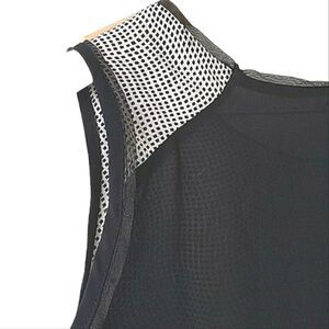 This is a polyester tank top with a fun wavy, geometric print. Features deep, curved side slits, mesh trim on armholes and neck, and hi-low hemline. EUC.