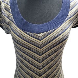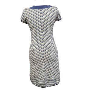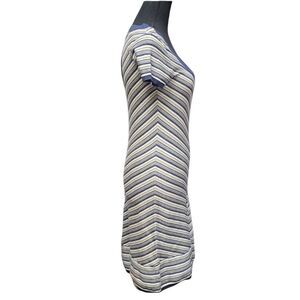 Pullover style short leeve 100% cotton T-Shirt dress. Dress has navy trim and navy, gray and yellow geometric designs. Has a rounded neck and is banded at the bottom.