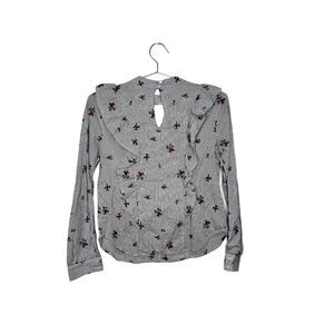 Ruffle detail. Keyhole detail. Button back closure. Striped pattern. Embroidered floral detail. Button closure at wrists.