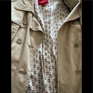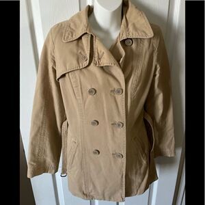 Mossimo tan short trench coat . Size M. wear buttoned up & belted for a dressy look or Un buttoned with jeans for a more casual look. Excellent condition from a smoke free/ pet friendly home.