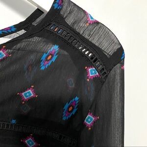 This Mossimo blouse features a unique triangle design and a bohemian Southwestern theme, perfect for adding some flair to any outfit. The sheer material adds an element of elegance, while the multicolor pattern allows for versatility in pairing with different bottoms. This blouse is a size Small and is ideal for women looking for a regular fit. The brand, Mossimo, is known for its quality and style, making this blouse a great addition to any wardrobe.