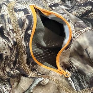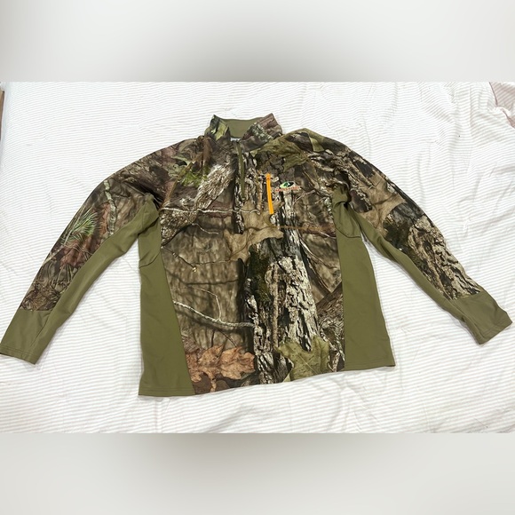 Mossy Oak jacket featuring a camouflage pattern. Includes green accents and a quarter-zip design. Logo displayed on the chest.