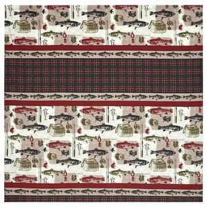 * It features a lake house vibe with a pattern of fish and red and green plaid.