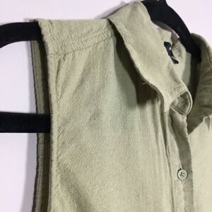 Good condition with flaw, see pic #2 faint smudge. Rayon 52%, linen 26%, cotton 22%. Sleeveless, collar, button down. Mossy green color. Express tag size S.
