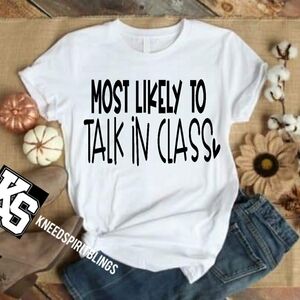 Here comes trouble! Most Likely to Talk in Class Tee is for you. Available in white, various sizes (small upcharge for larger sizes), crew or vneck. Specify tee type when ordering. Hoodies are $40. This is a unisex tshirt.