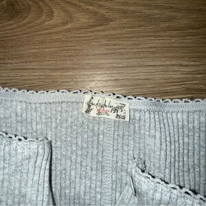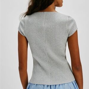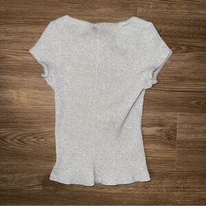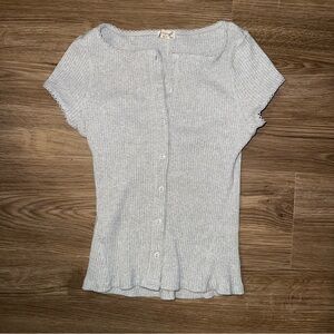 Features: Ribbed swit fabrication, crew neckline, button-front closure, capped sleeves, picot trim