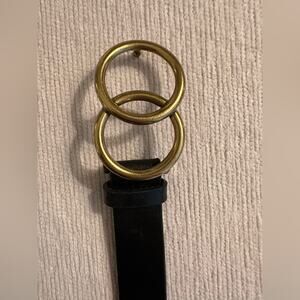 Get in on the popular trend of the women's double circle buckle leather belts! This wholesale and boutique best seller, designed with an overlapping metallic brass toned double circle buckle on a classic neutral leather belt, is the latest fashion trend that can be seen everywhere, from high and low rise jeans to skirts. This minimalist design complemented with high quality genuine black or tan leather is built for a timeless yet chic style that will definitely be a staple in your closet!