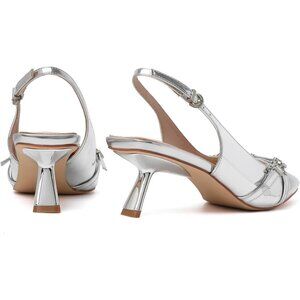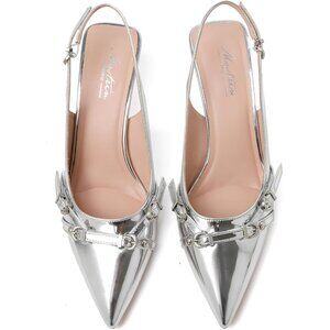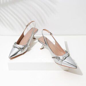 Mostrin Kitten Heel Silver Faux Leather Low Slingback Heels with Buckle