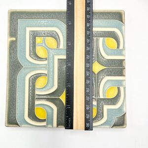 From Motawi Tileworks located in Ann Arbor, MI. This tile is from their Boneyard / Bone Yard, which is where they "sell second-quality, overrun, discontinued or just plain weird tile". The tile is approximately 6 by 6 inches and a half inch thick (see pictures for more precise measurements with a ruler). The pattern looks to be Ovation Deco Corner, Grey Blue, 66101 GB.