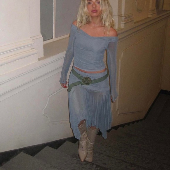 Motel Rocks mesh set in blue grey! trendy fairy mesh skirt and matching long sleeve over the shoulder top. both size XS. only worn once!