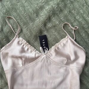 Soft cream slip dress with delicate straps, bow detail, and ruffle hem on bust. Simple feminine elegance from Motel Rocks. Wore once to get my marriage license, like new with tags.