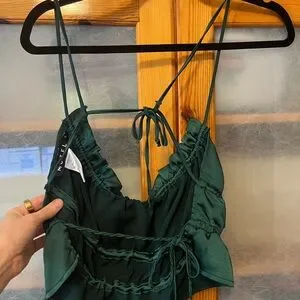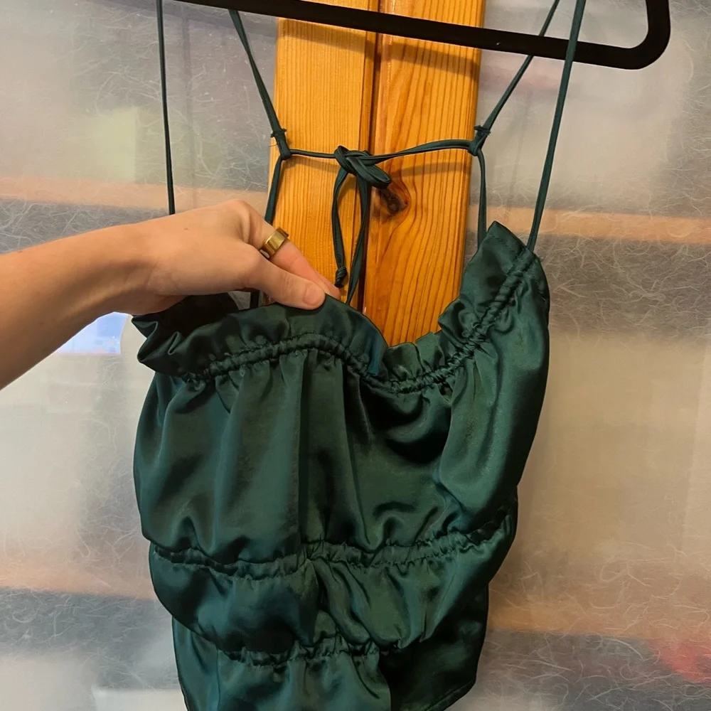Motel rocks emerald green, silk/satin feeling material. Cropped and ruched. Fully backless, has two tie straps in back. Looks a mess on the hanger but is really cute on.